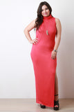 This plus size maxi dress is curve hugging with a side slit. Sleeveless and turtle neck design. Pull over style. Accessories sold separately. 95% Rayon. 5% Spandex. Made in U.S.A.