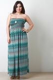 This plus size maxi dress features a zig zag pattern print, runched elasticized tube neckline, and flowy bottom. Accessories sold separately. Made in U.S.A. 95% Polyester, 5% Spandex.