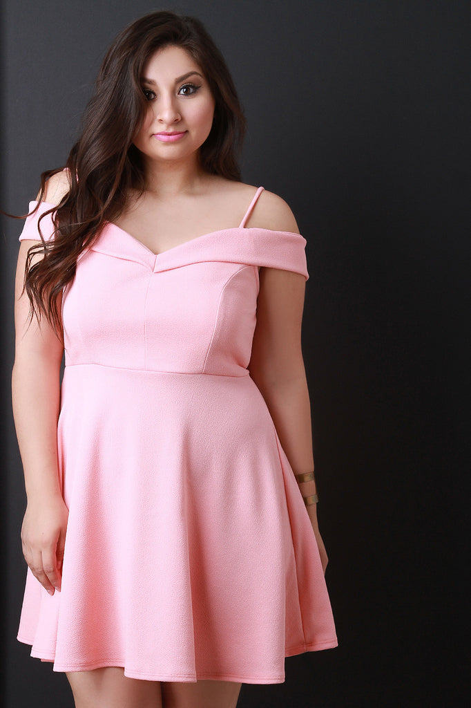 This p lus size dress features a structure off shoulder bardot neckline, spaghetti shoulder straps, textured knit fabrication, and cinched high waist seam. Accessories sold separately. Made in U.S.A. 95% Polyester, 5% Spandex.