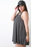 This plus size sleeveless dress features a soft jersey knit fabrication with stripe print throughout, scoop neckline, and flowy shift cut fit. Accessories sold separately. Made in U.S.A. 95% Rayon, 5% Spandex.