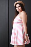 This glamorous fit & flare dress features a beautiful striped knit fabrication, high neck, and sleeveless design with fixed spaghetti shoulder straps. Finished with a mini-length circle skirt. Partially lined. Accessories sold separately. Shell: 93% Polyester, 7% Spandex. Lining: 100% Polyester.