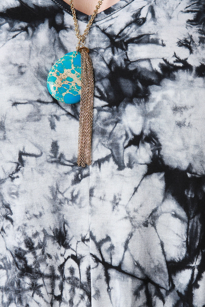 This plus size dress features a flowy knit fabrication, deep v-neckline, sleeveless fit, tie dye print throughout, and finished with an asymmetrical hemline. Accessories sold separately. Made in U.S.A. 95% Viscose, 5% Spandex.