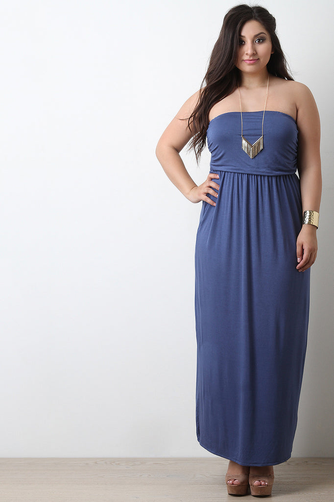 This plus size maxi dress features a soft jersey knit fabrication, strapless design, empire waist, and maxi-length hem. Top is partially lined. Accessories sold separately. Accessories sold separately. 97% Rayon, 3% Spandex.