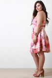 This plus size fit & flare floral print fabrication, split sweetheart neckline with v-shaped boning, pleated waistline, and finished with double-front layered flare skirt. Accessories sold separately. Made in U.S.A. 96% Polyester, 4% Spandex.