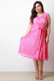 This gorgeous plus size fit & flare dress features a beautiful floral lace fabrication, round neckline, sleeveless design, and midi-length flare skirt. Fully lined. Accessories sold separately. Made in U.S.A. Self: 100% Polyester. Lining: 100% Polyester.