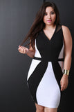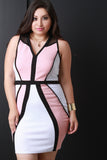 This plus size bodycon dress features textured knit, color block design, v-neck, semi-sheer mesh panel, and mini length. Accessories sold separately. 97% Polyester, 3% Spandex.