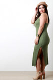This plus size dress features a ribbed knit fabrication, halter neckline, sleeveless fit, and a strap detail at back. Finished with a maxi-length hemline and side slit. Accessories sold separately. Made in U.S.A. 96% Rayon, 4% Spandex.