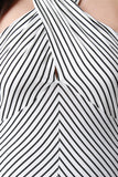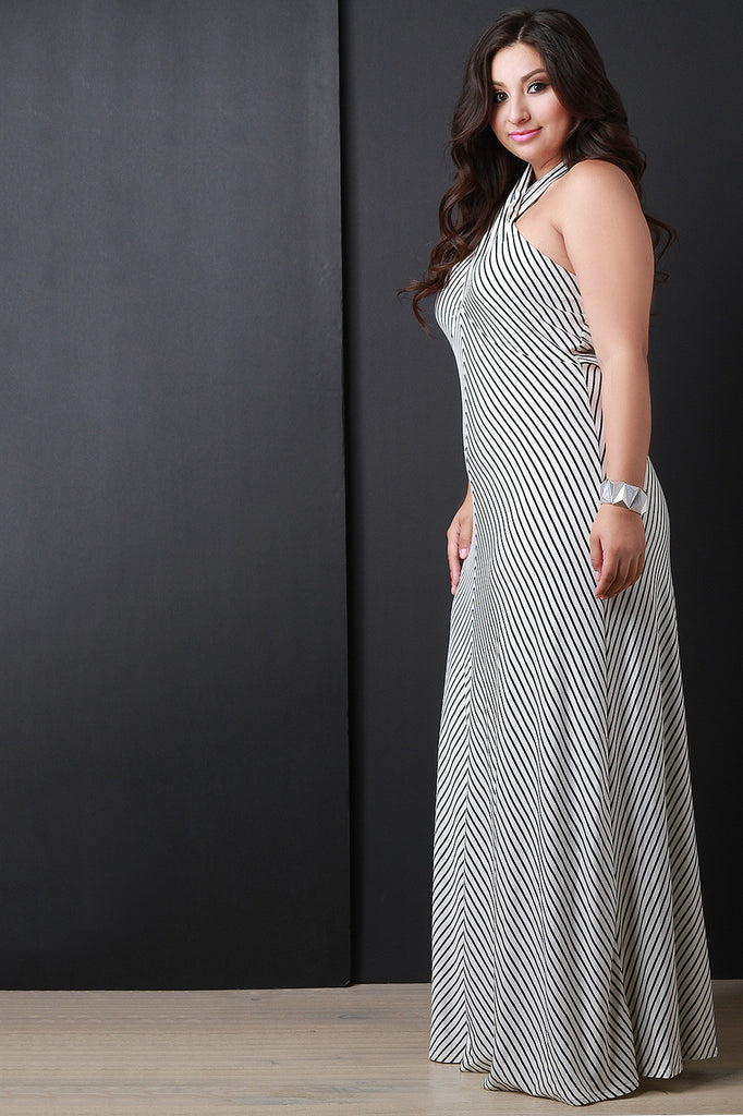 This plus size dress features striped jersey knit, criss-cross neck, open back, and maxi length. Finished with partial lining. Accessories sold separately. S: 68% Rayon, 29% Polyester, 3% Spandex. L: 100% Polyester.