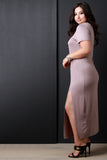 This plus size maxi dress features a soft knit fabrication, lace up deep v neckline, short sleeves, and a thigh high side slit. Accessories sold separately, Made in U.S.A. 95% Rayon, 5% Spandex.