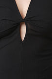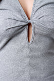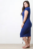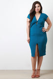 This sexy plus size dress features a rib knit fabrication, short sleeves, a deep v neckline with a twisted detail an keyhole opening, slim curve hugging silhouette, midi length hemline and a high center front slit. Accessories sold separately. Made in U.S.A. 57% Rayon, 38% Polyester, 5% Spandex.