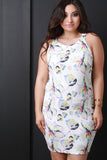 This cute plus size dress features knit fabrication, watercolor style floral print, rounded neckline, cage like racerback design, curve hugging bodycon fit and a mini length hemline. Accessories sold separately. Made in U.S.A. Shell: 95% Polyester, 5% Spandex. Contrast: 100% Polyester.