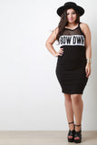 This plus size bodycon dress features a square neckline, semi-sheer mesh yoke, sleeveless, sculpture jersey knit fabrication, and "BOW DWN" Print at front. Accessories sold separately. Made in U.S.A. 95% Cotton, 5% Spandex. Contrast: 100% Polyester.