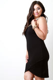 This stylish plus size dress features a stretchy knit fabric, gold and crystal trimmed, caged yoke construction, halter-style neckline, and sleeveless fit. Finished with a button hook closure at nape and asymmetrical hemline. Accessories sold separately. Made in U.S.A. 67% Viscose, 28% Nylon, 5% Spandex.