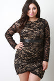 This plus size dress features a floral lace overlay, round neckline, longsleeves construction, and front vegan leather waist detail. Finished with a full lining and rear hidden zipper fastener. Accessories sold separately. 92% Nylon, 8% Spandex.