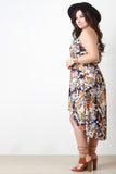 This plus size dress features a round neckline, cutaway sleeveless design, elasticized cinched waist, highlighted with a patent bow belt, high low hemline, and floral pattern print. Accessories sold separately. Made in U.S.A. 100% Polyester.
