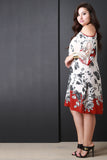 This chic plus size shift dress features a cold shoulder design, crochet lace sleeve inset, spaghetti straps, back tie, two tone floral print pattern scoop neckline with gather detail and a low cut back. three quarter length bell sleeves, and a knee length hemline. Accessories sold separately. 100% Polyester.