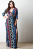 This plus size dress features a surplice v-neckline, quarter-length sleeves, left vent slit, and a self-tie waist sash. Accessories sold separately. Made in U.S.A. 95% Polyester, 5% Spandex.