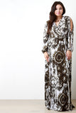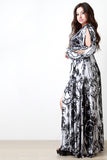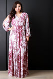 This beautiful plus size dress features a smooth stretchy knit fabric, splattered tie dye print, surplice wrap construction with self-tie waist sash, and slit-detailed long sleeves. Finished with a maxi-length hemline. Accessories sold separately. Made in U.S.A. 95% Polyester, 5% Spandex.