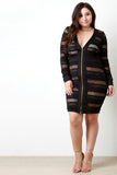 This bodycon plus size dress features a lace hole patterned fabric, deep v-neckline with front zip-up closure, and longsleeves construction. Finished with a midi-length hemline. Accessories sold separately. Made in U.S.A. Self: 90% Nylon, 10% Spandex. Contrast: 95% Polyester, 5% Spandex.