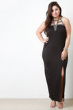 This plus size sleeveless dress is maxi silhouette. It has a round neckline with a yoke cutout, featuring encrusted faux gems. Elasticized collar line. Soft knit, unlined. Finished with a diagonal slit. Accessories sold separately. 92% Polyester, 8% Spandex.