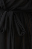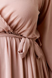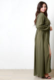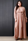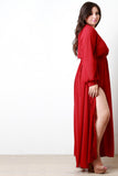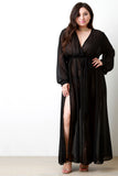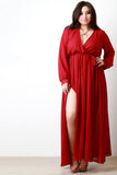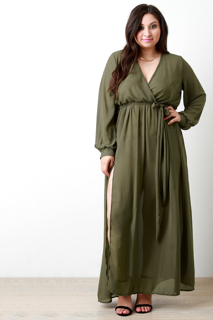 This daring plus size maxi dress features a semi-sheer chiffon fabric, surplice neckline, elasticized waist with self-tie sash, front high slit, and cuffed longsleeves. Accessories sold separately. Made in U.S.A. 100% Polyester.