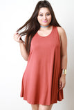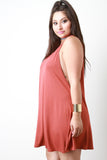 This plus size dress features a soft jersey knit fabrication, side cutout sleeveless design, round neckline, single button closure at nape, large keyhole back, and swing cut fit. Accessories sold separately. Made in U.S.A. 92% Rayon, 8% Spandex.