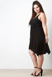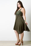 This plus size dress features a woven fabric, crochet yoke design, thin shoulder straps, open back, and handkerchief hemline. Accessories sold separately. Made in U.S.A. 100% Rayon.