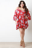 This plus size mini dress features a woven fabrication, floral print pattern, cold shoulder cut out, adjustable spaghetti straps, long bell sleeves, tiered ruffle design, with a crochet dot trim set in to the waist seam. Accessories sold separately. 100% Rayon.