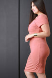 This plus size bodycon dress features a v-neckline, front cutout detail, strappy open back construction, short sleeves, and stretchy bodycon fit. Accessories sold separately. Made in U.S.A. 92% Polyester, 8% Spandex.