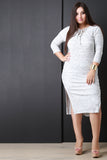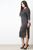 This plus size dress features a rib knit fabrication, marled coloring, lace up v neckline, half sleeves, curve hugging fit, side slit, and a midi length hemline. Accessories sold separately. Made in U.S.A. 95% Rayon 5% Spandex.