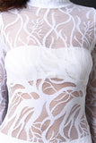 This bodycon dress features a semi-sheer mesh fabrication, stretchy silhouette fit, mock neckline, long sleeves, midi length hemline, and zipper fastener at back. Made in U.S.A. Accessories sold separately. 90% Nylon, 10% Spandex.