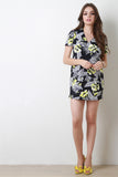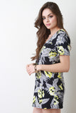 This tropical print fabrication, v-neckline, and short sleeves design. Finished with an exposed zip closure at the back. Accessories sold separately. 95% Polyester, 5% Spandex.