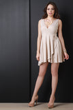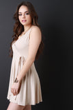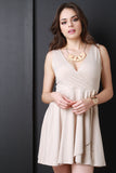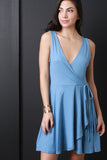 This dress features a surplice v-neckline, smooth stretchy fabrication, wrap inspired design, and sleeveless construction. Finished with a self-tie drawstring at waist. Accessories sold separately. Made in U.S.A. 95% Polyester, 5% Spandex.