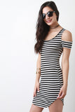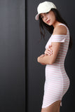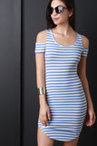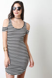 This bodycon dress features a round neckline, short sleeves with cold shoulders, and round hemline. Accessories sold separately. Made in U.S.A. 95 % Polyester, 5% Spandex.
