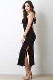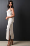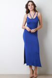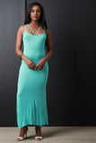 This maxi dress features soft jersey knit, strappy neck and back, sleeveless design, and two side slits. Accessories sold separately. Made in U.S.A. 96% Rayon, 4% Spandex.