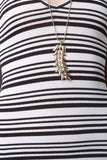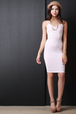This sleeveless dress features soft stretch knit, horizontal stripes, deep v-neckline, criss-cross and cut out back, and midi length. Accessories sold separately. Made in USA. 95% Polyester, 5% Spandex.