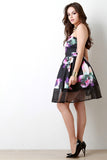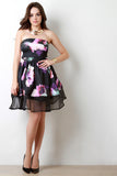This stylish dress features a floral print pattern, tube top off-the-shoulder neckline, and flare skirt with mesh trimming detail. Finished with a lining. Accessories sold separately. Made in U.S.A. 95% Polyester, 5% Spandex.