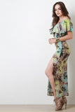 This maxi dress features multi color tie dye print design on jersey knit fabrication, elasticized off the shoulder neckline, flutter tier, and vent slit on right side. Accessories sold separately. Made in U.S.A. 96% Rayon, 4% Spandex.