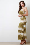 This dress features a smooth stretchy knit fabric with tie dye print pattern, round neckline, and sleeveless construction. Finished with a racerback with open midsection and maxi-length hemline. Accessories sold separately. Made in U.S.A. 95% Cotton, 5% Spandex.