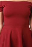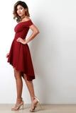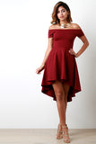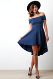 This simply cute skater dress features a soft stretchy knit fabrication, off the shoulder neckline, and ruffled skirt finished with high-low hemline. Accessories sold separately. Made in U.S.A. 65% Rayon, 30% Nylon, 5% Spandex.