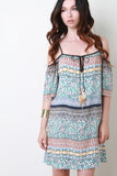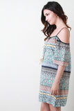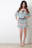 This shift dress features mixed pattern print, self-tie feather and bead drawstring, spaghetti straps, open shoulders, short sleeves, and mini length. Accessories sold separately. Made in USA. 100% Rayon.