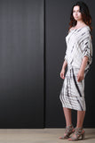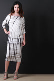 This casual dress features tie dye jersey knit, boat neckline, asymmetrical draped top, long dolman sleeves, and midi length. Accessories sold separately. Made in USA. 92% Polyester, 8% Spandex.