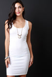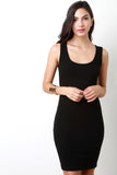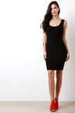 This casual dress features a ribbed knit fabrication, scoop neckline, sleeveless construction, and mini-length hemline. Accessories sold separately. Made in U.S.A. 60% Polyester, 35% Rayon, 5% Spandex.