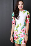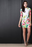 This bodycon dress features smooth stretch fabric, floral print, round neckline, half sleeves, and mini length. Accessories sold separately. Made in USA. 95% Polyester, 5% Spandex.