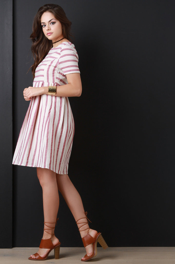 This breezy babydoll dress features a pretty stripe prints, round neckline, and short cuff sleeves. Finished with an empire waist, side seam pockets, and concealed side zipper closure. Fully lined. Shell: 100% Cotton. Lining: 100% Cotton.