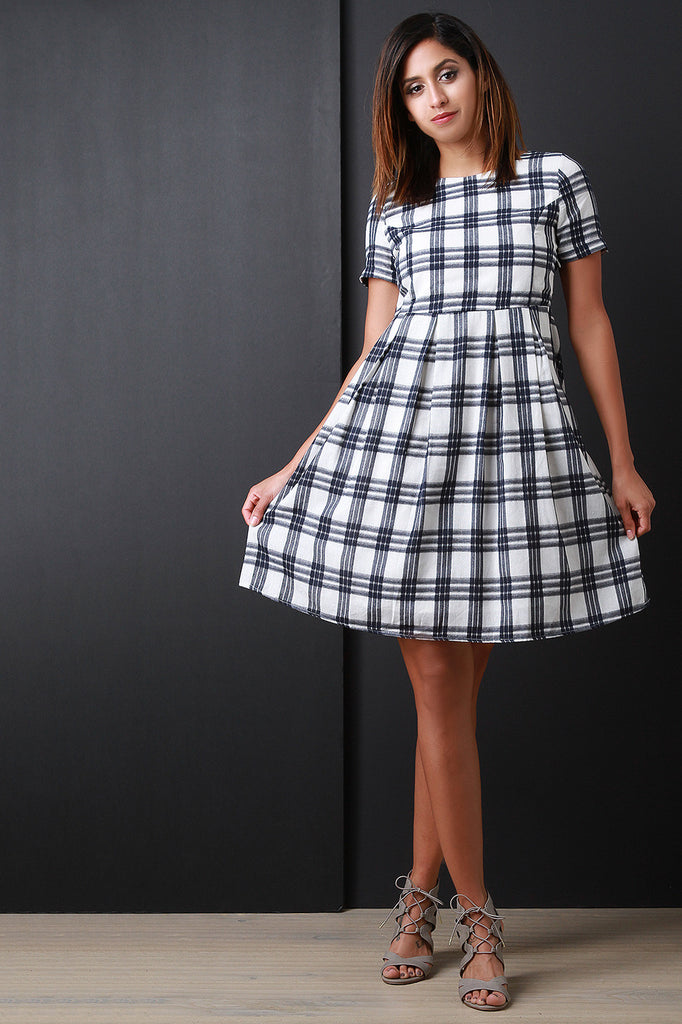 This sweet babydoll dress features a pretty plaid prints, round neckline, and short cuff sleeves. Finished with an empire waist, side seam pockets, and concealed side zipper closure. Fully lined. Shell: 100% Cotton. Lining: 100% Cotton.