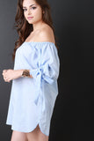 This shift dress features elasticized off the shoulder neckline, long sleeves, self-tie bows, and mini length. Accessories sold separately. 65% Cotton, 35% Polyester.
