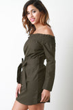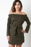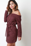 This gorgeous mini dress features a smocked off-the-shoulder neckline, cuffed long sleeves, and self-tie sash closure at waist. Accessories sold separately. 100% Cotton.