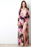 This daring dress features a sheer mesh fabric, floral print pattern throughout, plunging v-neckline, and tab-held high vent slit. Finished with a cuffed longsleeves, maxi-length hemline, and boxer brief underlay. Accessories sold separately. Made in U.S.A. 95% Polyester, 5% Spandex.