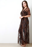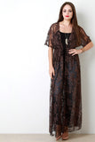 This eye-catching dress features a sheer mesh fabric with shimmering floral patterns, self-tie waist drawstring, open front, and short sleeves. Finished with a maxi-length hemline. Accessories sold separately. Made in U.S.A. 90% Nylon, 10% Lurex.
